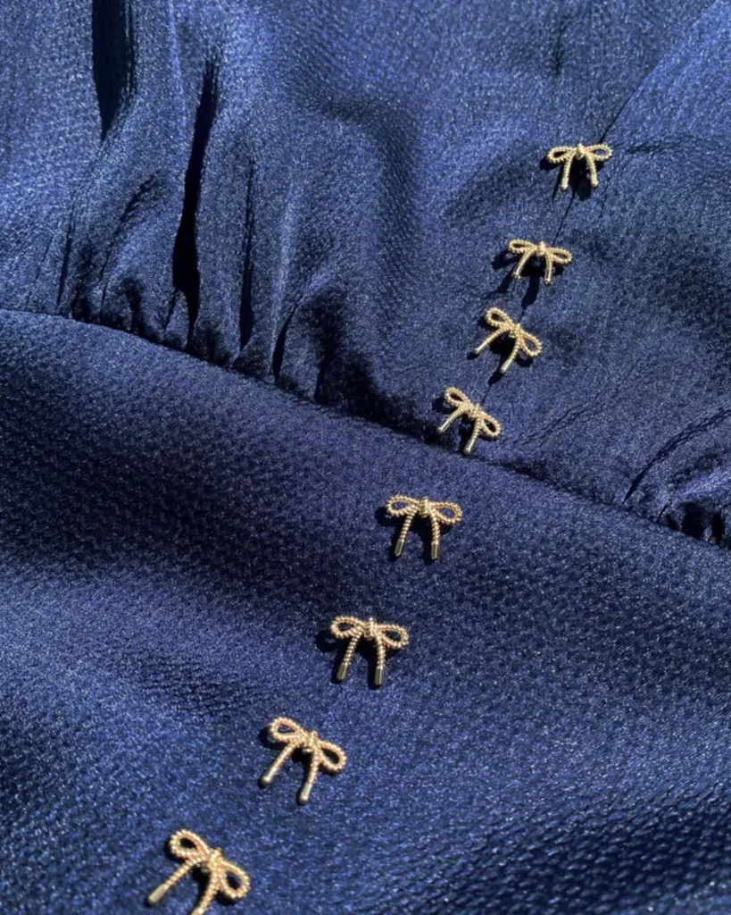 The Evelyn Dress is crafted from a fluid silky touch fabric that drapes beautifully for an elegant fit. Gold bow buttons add a sweet touch down the front, while the midi length, V-neckline, and flattering gathers at the shoulders and underbust make it effortlessly chic.