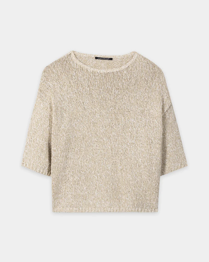 Loosely knitted sweater made from tape yarn in a mouliné look. A boat neckline, dropped shoulders and cropped sleeves complete the design.