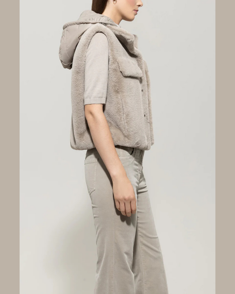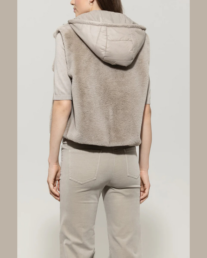 Vest made of very soft woven fur on a nylon lining in a short, sporty fit with two indicated breast pockets and two open side pockets. The quilted and padded hood can be adjusted and removed. The vest closes at the front with a press stud placket.