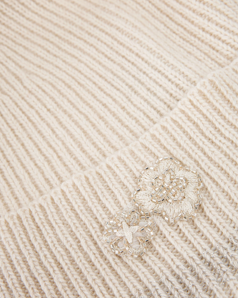 Hat made from a soft cotton blend with a touch of luxurious cashmere. The subtle stripes with lurex create a stylish sheen. With a cosy bobble and flower appliqué for that special something. Comfortable to wear, ideal for cooler days.