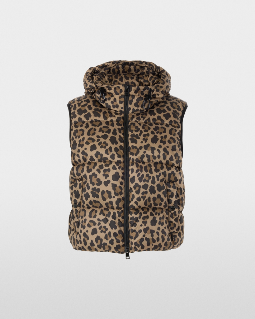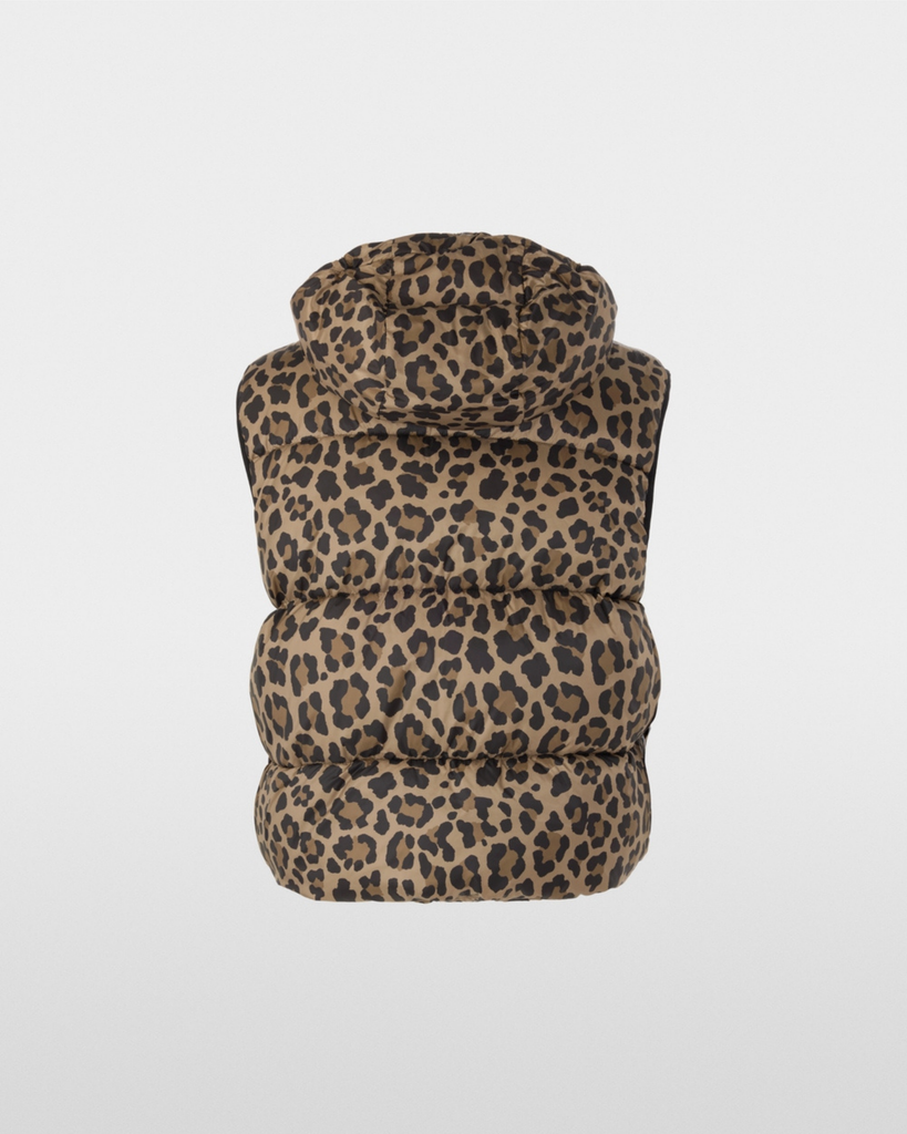 Hip-length vest top with faux down and hood, from the Rethink Together label. Featuring a leopard print design on the outside and a contrasting doggy print lining on the inside. Two-way zip and side pockets with press studs offer functionality. A fashionable companion with statement character.